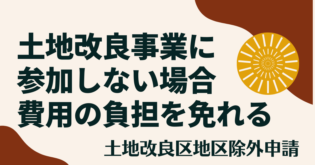 土地改良区除外申請とは、農地を住宅その他に農地転用する場合に、本土地改良区の台帳より除籍、土地改良区の費用をかける地区から除外するにあたって、土地改良区に必要な手続きをすることになっています。